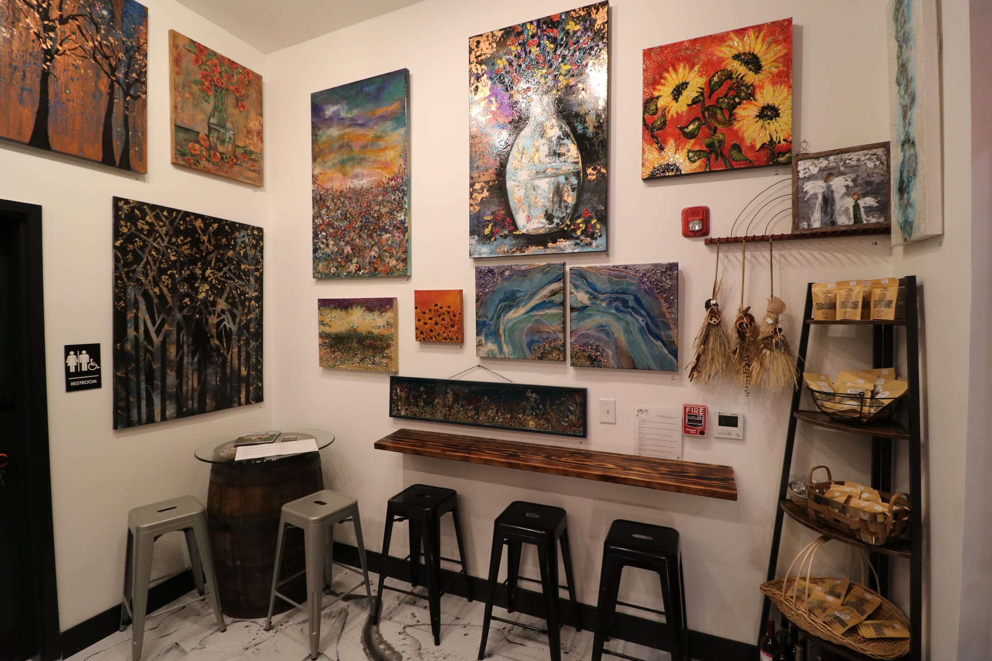 Mary, a trained artist with a degree in art education, fills the space with her original paintings and mixed-media pieces. Her work incorporates resin, earth elements, and natural crystals, and she has been painting for most of her life. She believes everyone should have the opportunity to own original art, which is why most of her pieces range from $175 to $1,200, with many priced accessibly in the $375 to $475 range.