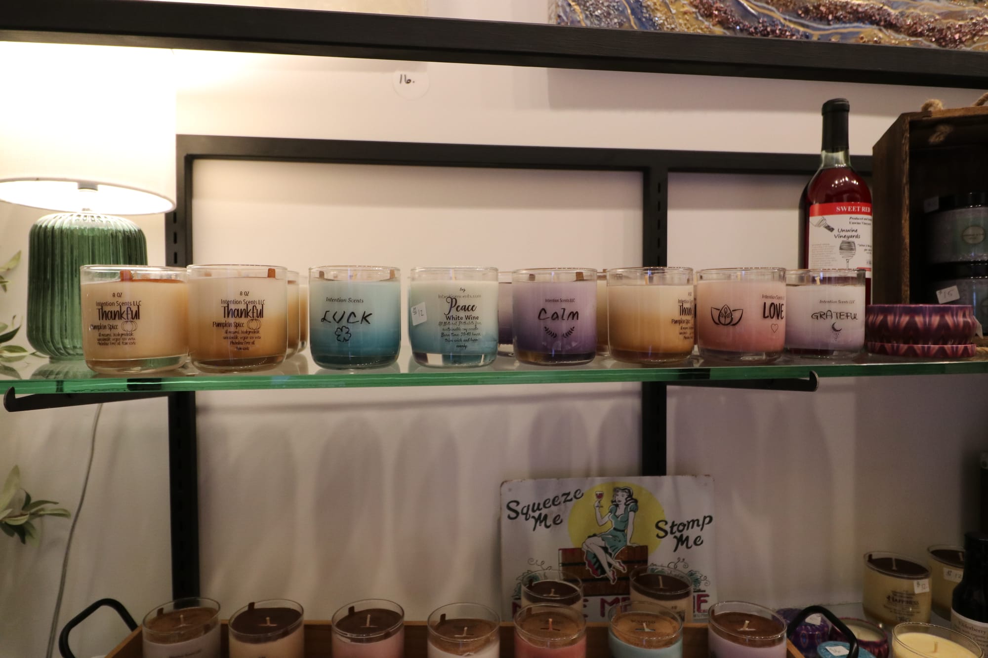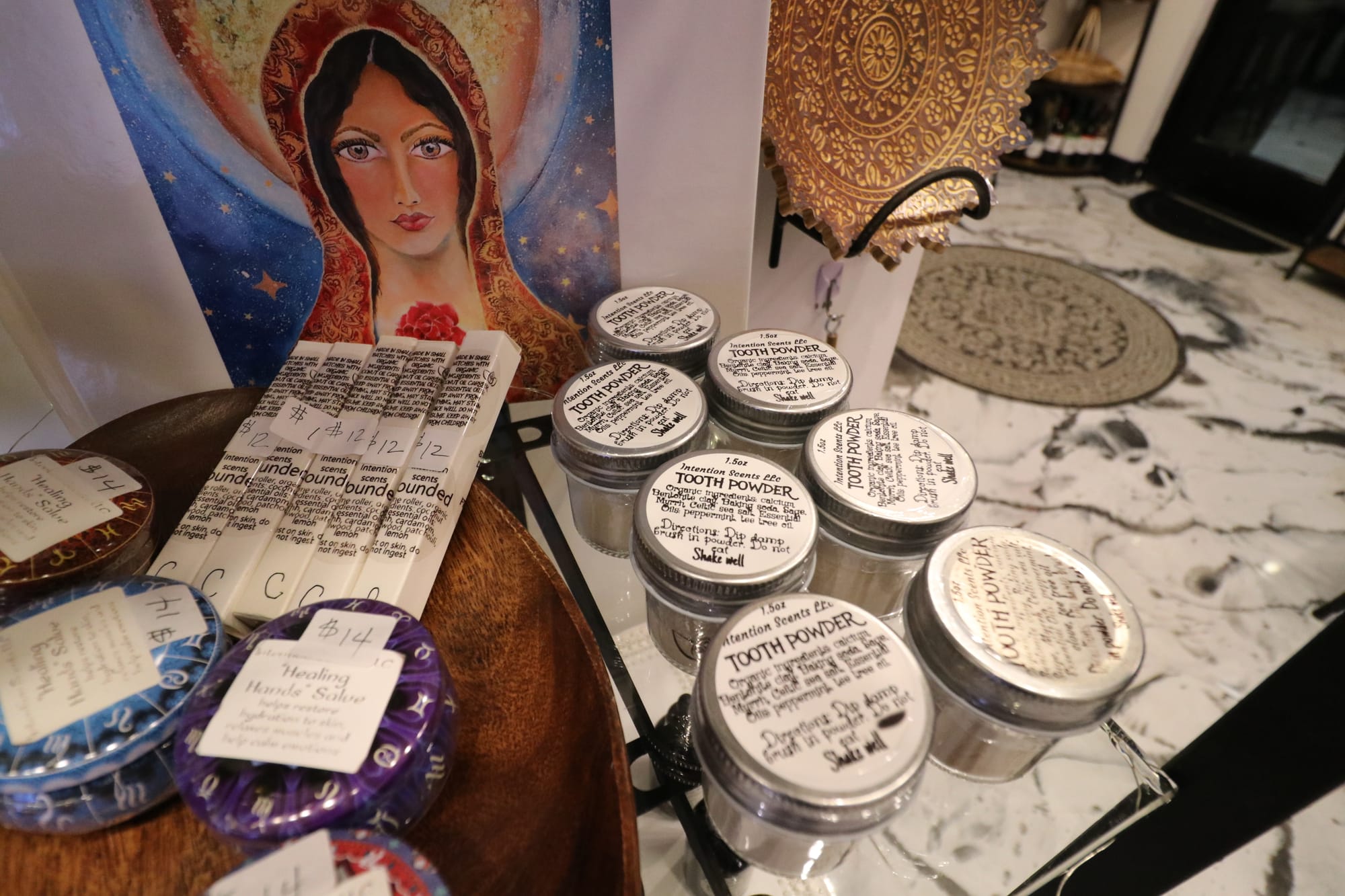 Along with her artwork, Mary creates a line of all-natural, chemical-free products that has quickly become a favorite among customers. This includes tinctures, magnesium spray for sleep, natural tooth powder made with bentonite clay and myrrh, herbal remedies, elderberry syrup, medicinal teas, and small-batch candles made from a soy, apricot, and beeswax blend. Each candle is free of phthalates and includes an intention such as love, peace, grateful, or calm.